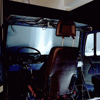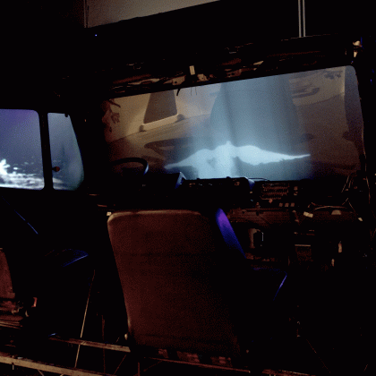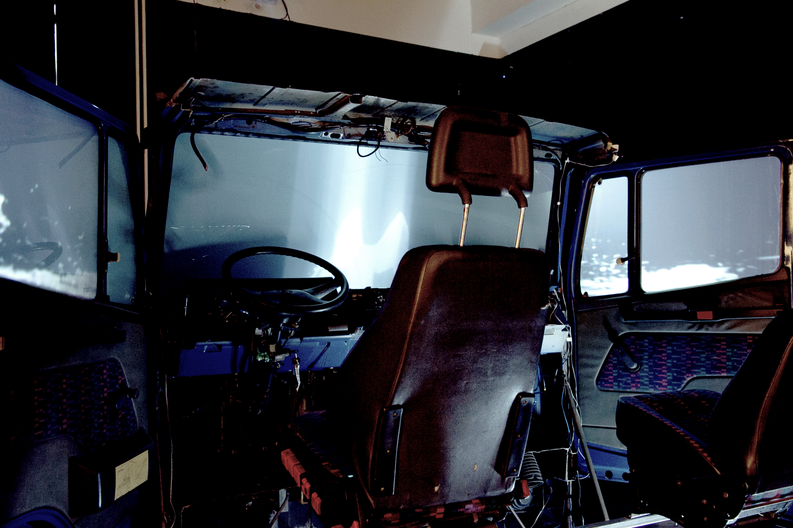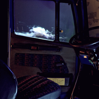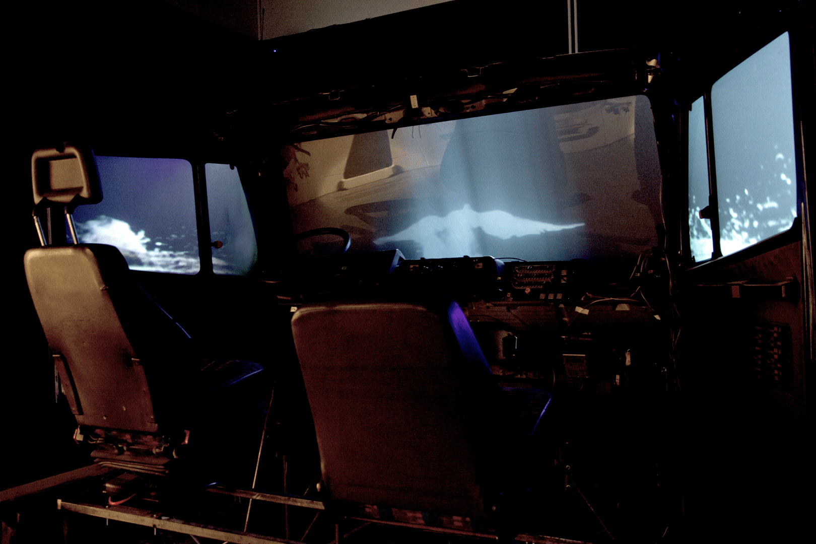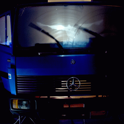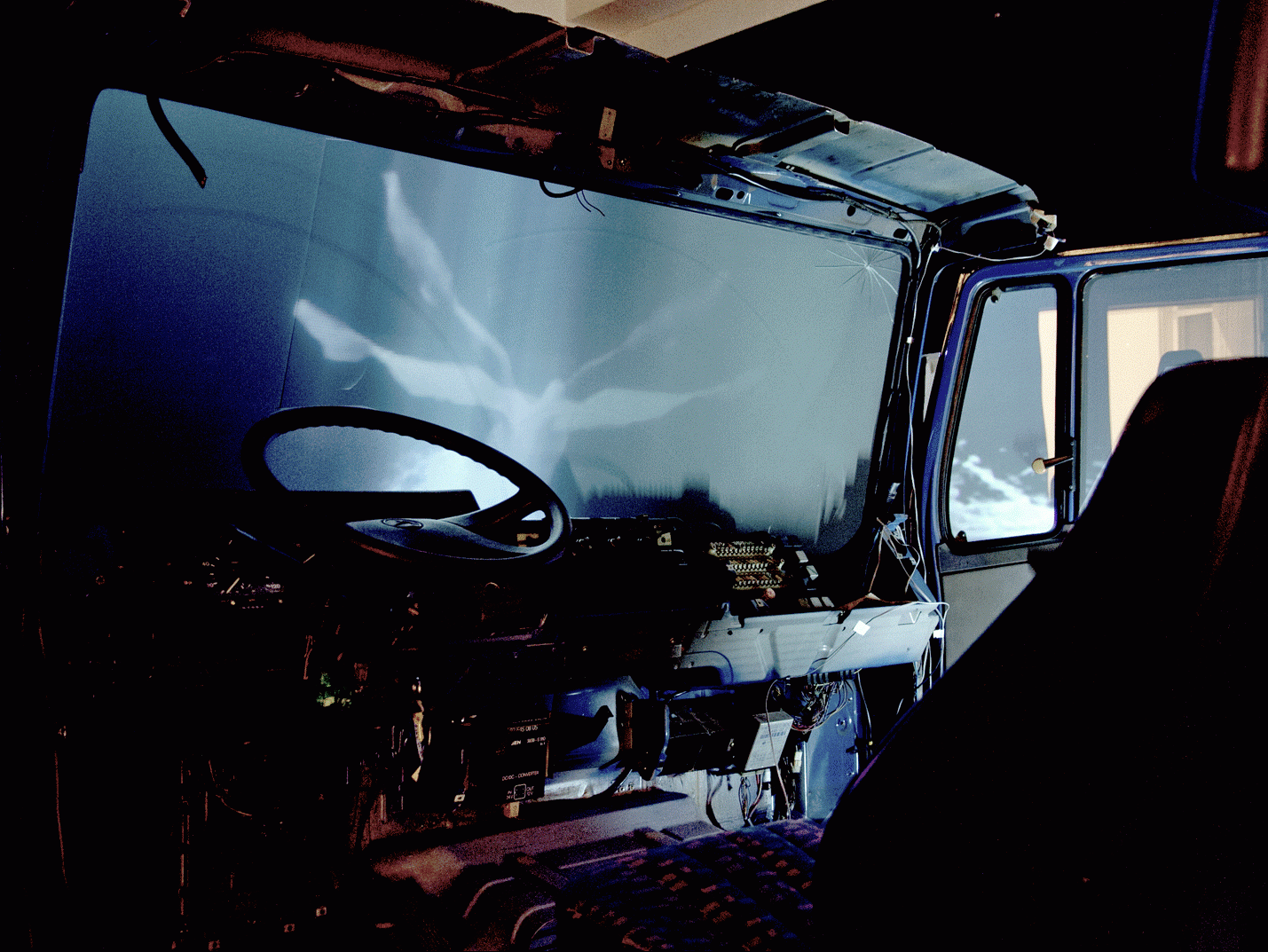 Die Windschutzscheibe und die Scheiben der Türen werden zur Projektionsfläche einer vorgestellten Reise. Das aufspritzende Wasser lässt den Eindruck entstehen, dass sich der Lkw auf der Fahrt befindet und der Zuschauer mit ihm. Der Schwan, der im Rhythmus des Scheibenwischers auftaucht bzw verschwindet, fliegt voraus; Er gibt den Weg an als eine Figur, die für Ideale und Wünsche steht. In der Mythologie ein Mittler zwischen Diesseits und Jenseits, führt er hier den Betrachter von der Realität in die Vorstellung. Durch die geöffnete Stellung der Türen vervollständigt sich die Front zu einem Triptychon. Seine Zentralität im Raum schafft eine sakrale Athmosphäre.